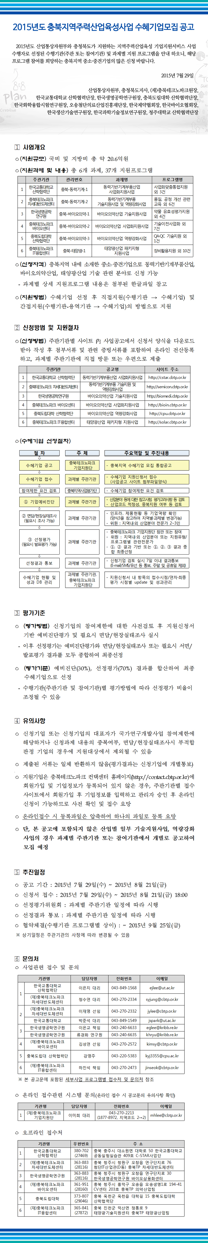 2015년도 산업통상자원부와 충청북도가 지원하는 지역주력산업육성 기업지원서비스사업 수행자로 선정된 수행기관(주관 또는 참여기관) 및 과제별 지원 프로그램을 안내하오니, 해당 프로그램 참여를 희망하는 충북지역 중소 중견기업의 많은 신청 바랍니다.