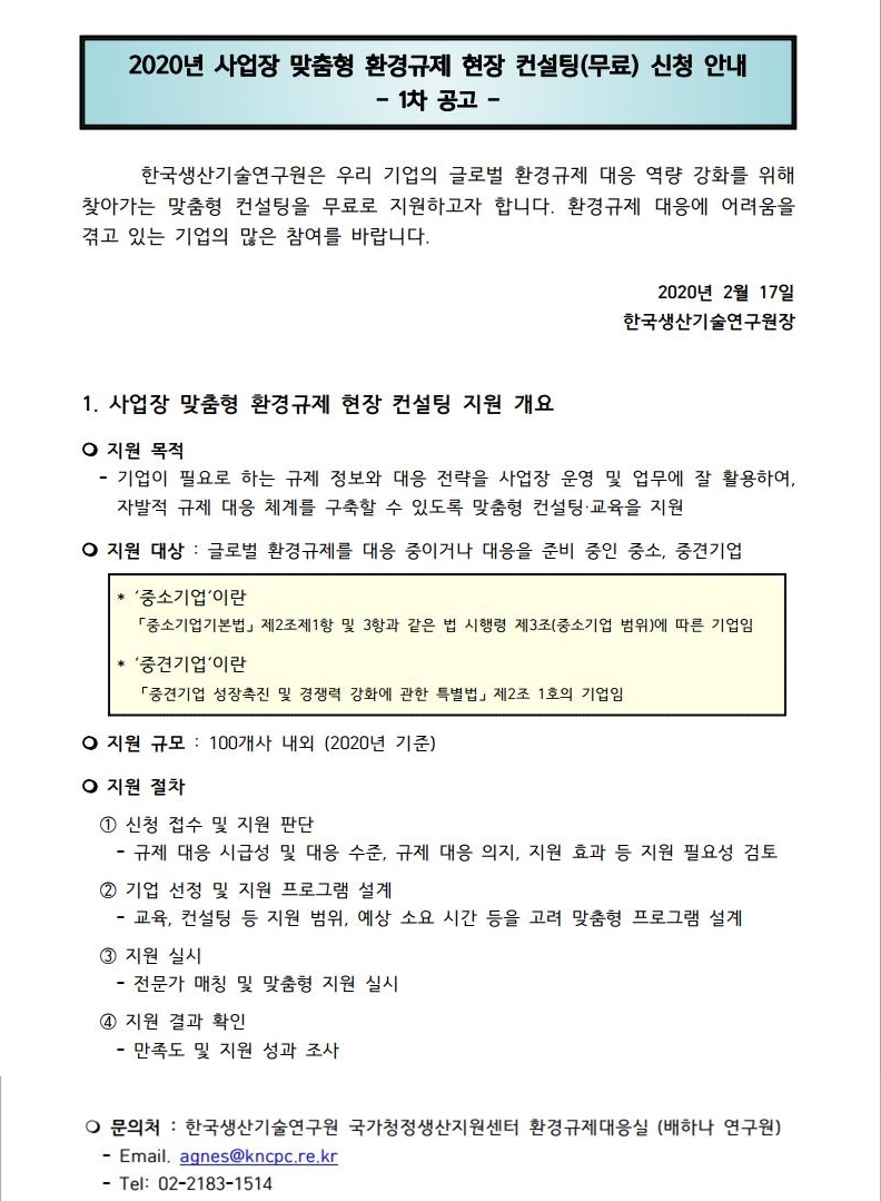 2020년 사업장 맞춤형 환경규제 현장 컨설팅(무료) 신청 안내 (1차 공고)