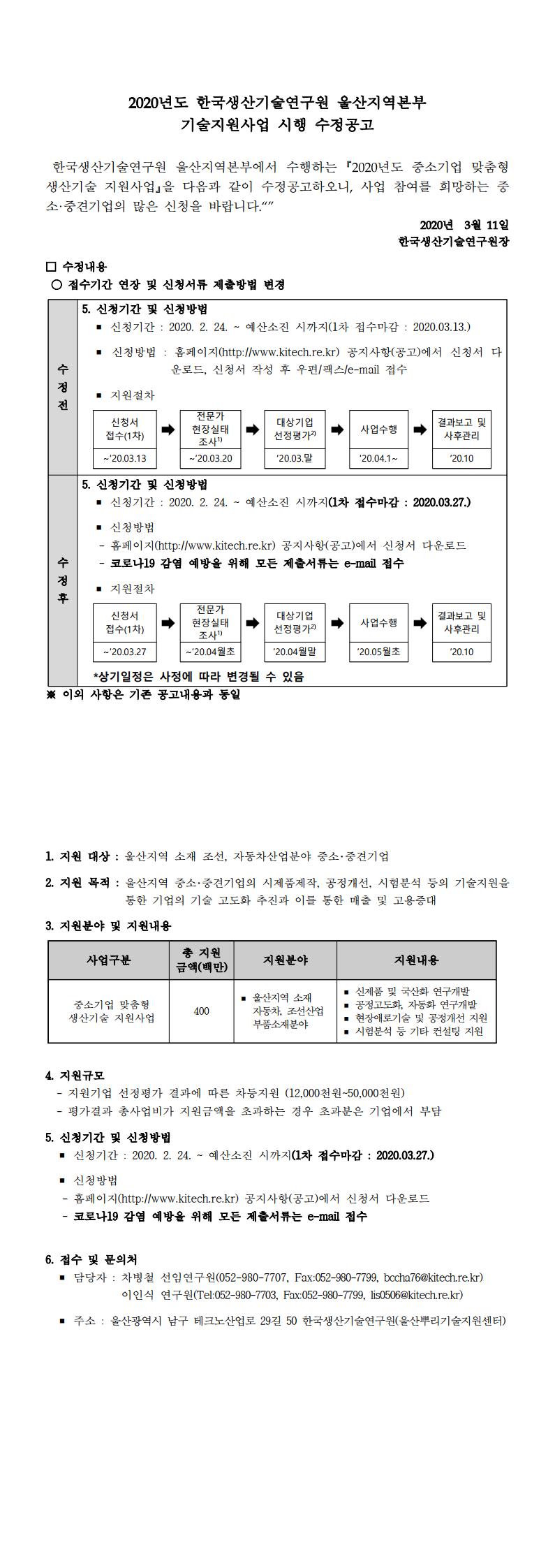 2020년도 한국생산기술연구원 울산지역본부 기술지원사업 시행 수정공고