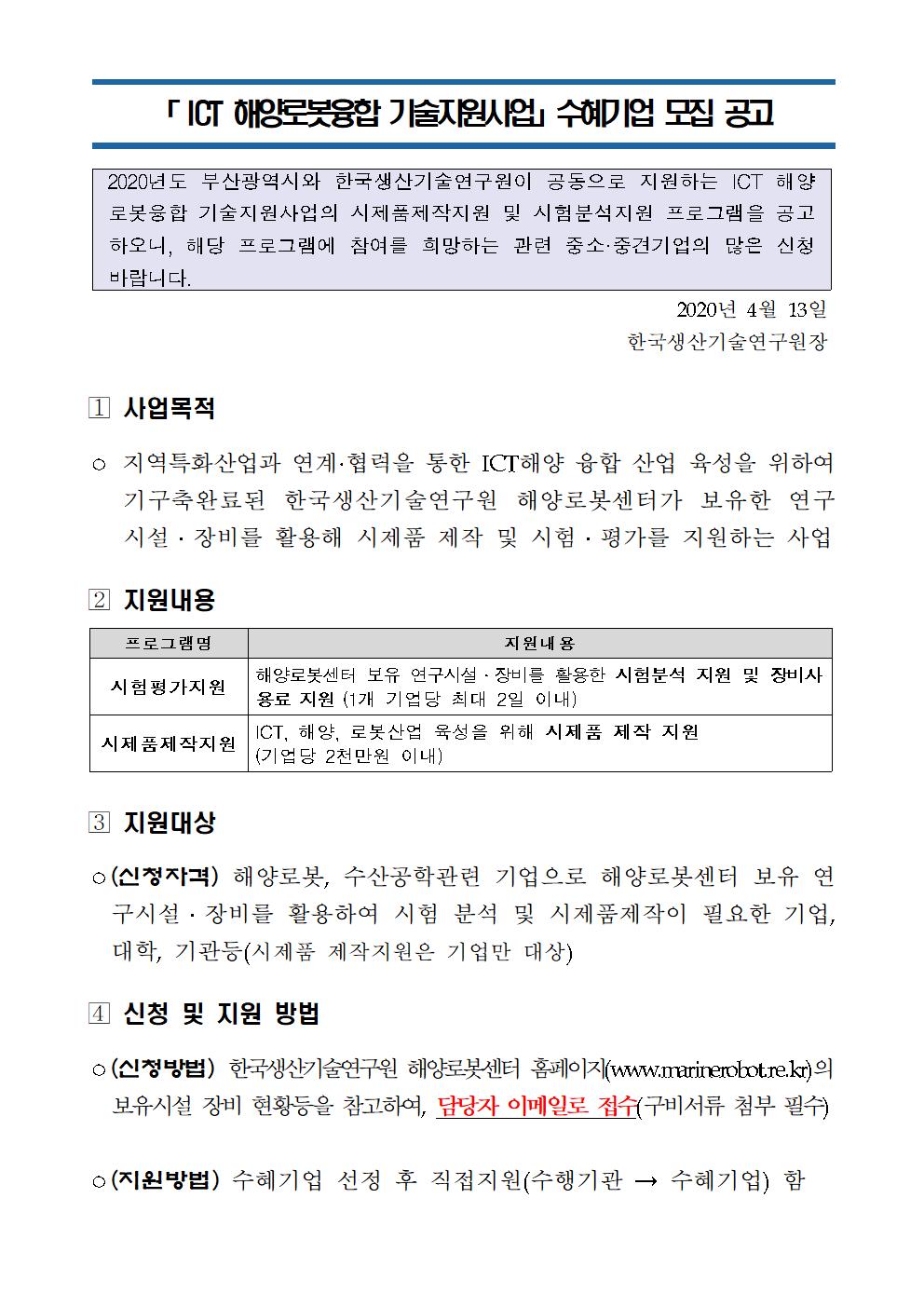 「ICT 해양로봇융합 기술지원사업」수혜기업 모집 공고