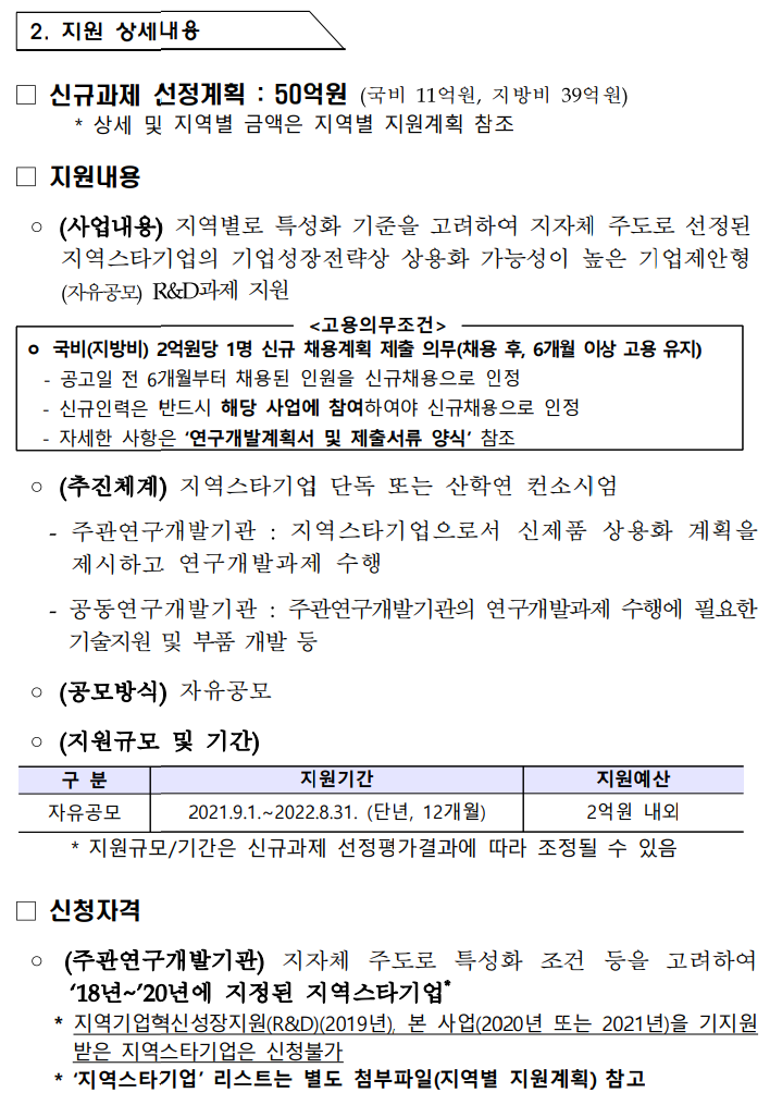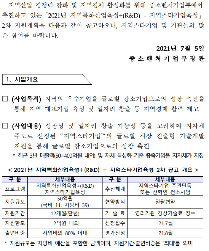 2021년도 지역특화산업육성+(R&D) - 지역스타기업육성 2차 지원계획 공고 -