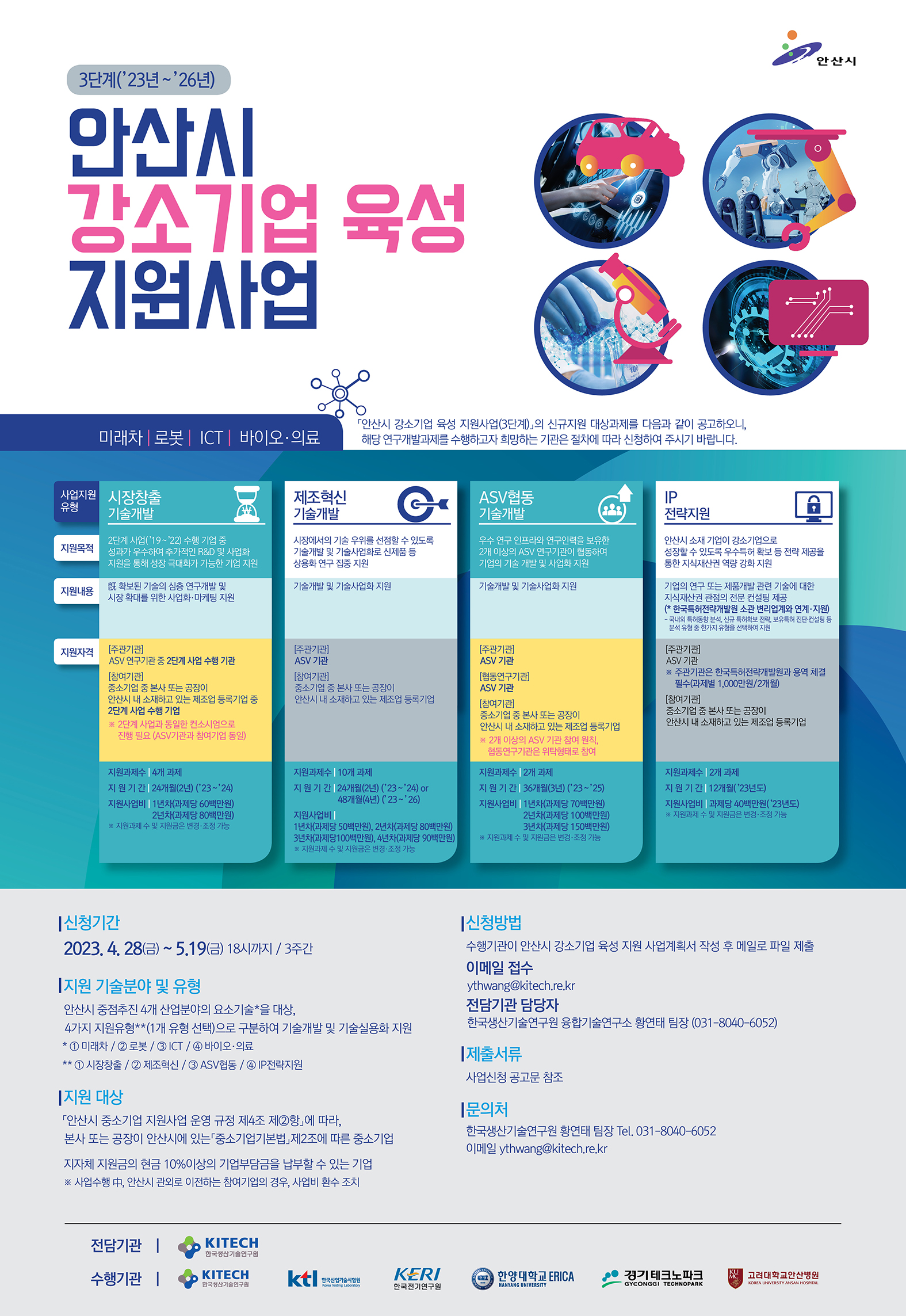 안산시는 한국생산기술연구원 융합기술연구소와 함께, 안산시 소재 중소기업의 기술개발 및 실용화연구를 통해 강소기업으로 육성코자 4년 단위로 기업지원 사업을 수행하고 있습니다. 이와 관련하여, 3단계(`23년~`26년) 안산시 강소기업 육성 지원사업을 아래와 같이 공고하오니, 안산사이언스밸리(ASV) 내 기관(소속 연구책임자)과 안산시 소재 중소기업의 많은 관심을 부탁드립니다.