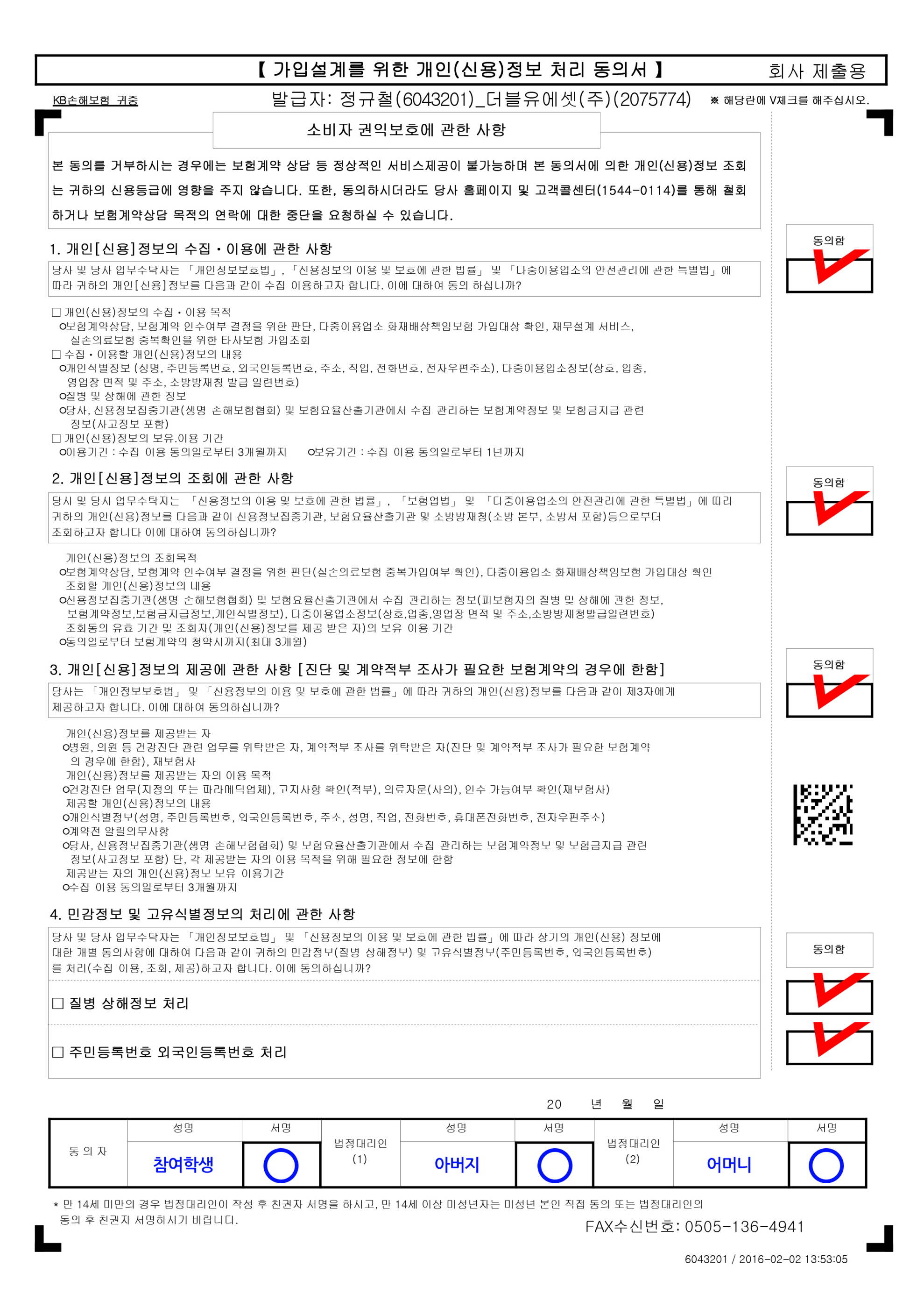 * 신청서 중 개인정보 처리 동의서(단체보험 가입용)는 반드시 친필(본인 및 보호자(법정대리인)) 서명 후 제출