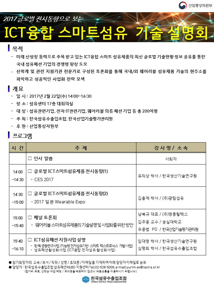 o 미래 신성장 동력으로 주목받고 있는 ICT 융합 스마트 섬유제품의 최신 글로벌 기술현황 정보 공유를 통한 국내 섬유패션기업의 경쟁력 향상 도모