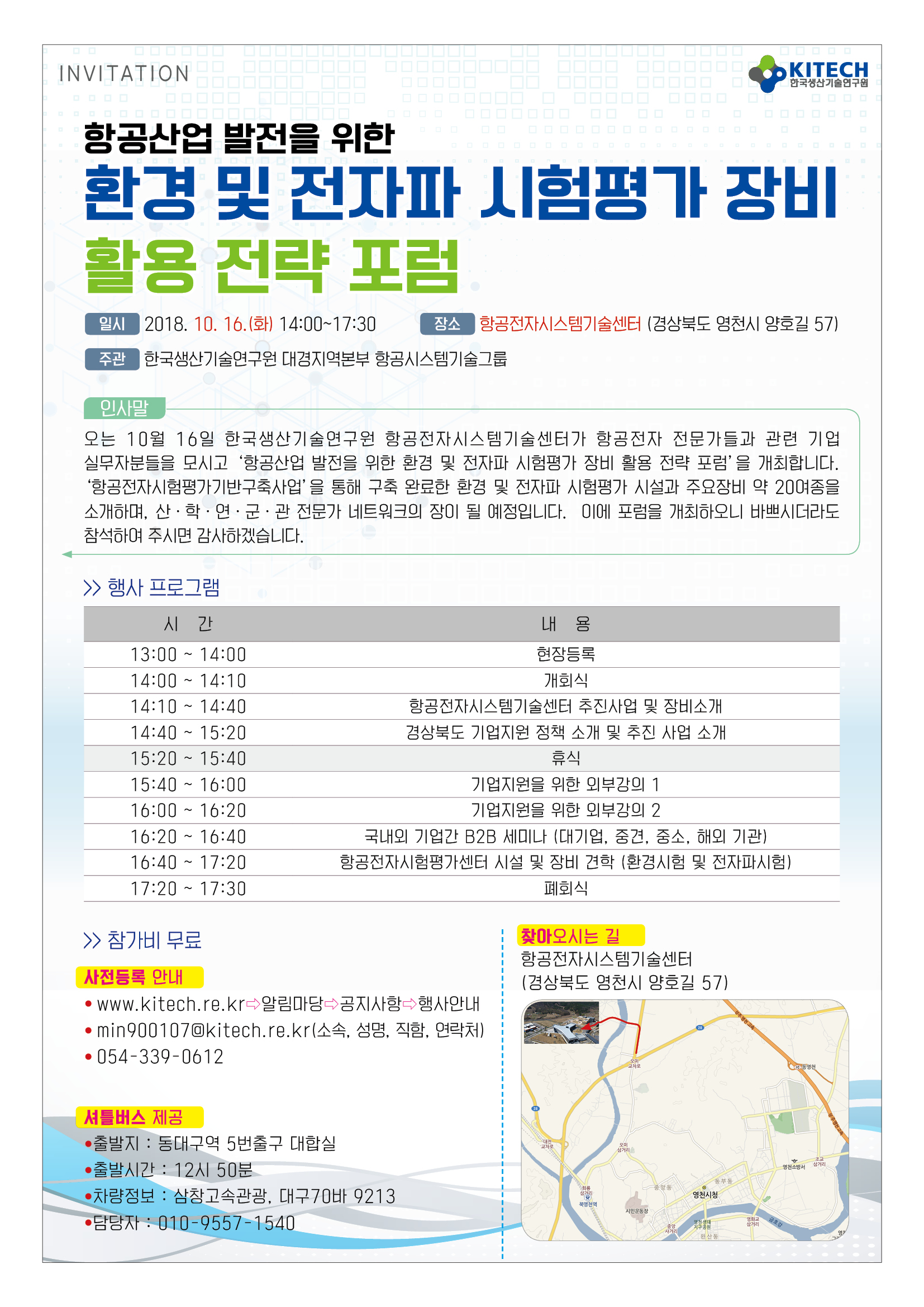 오는 10 월 16 일 한국생산기술연구원 항공전자시스템기술센터가 항공전자 전문가들과 관련 기업 실무자분들을 모시고 ‘항공산업 발전을 위한 환경 및 전자파 시험평가 장비 활용 전략 포럼’을 개최합니다. ‘항공전자시험평가기반구축사업’을 통해 구축 완료한 환경 및 전자파 시험평가 시설과 주요장비 약 20여 종을 소개하며, 산・학・연・군・관 전문가 네트워크의 장이 될 예정입니다. 이에 포럼을 개최하오니 바쁘시더라도 참석하여 주시면 감사하겠습니다.