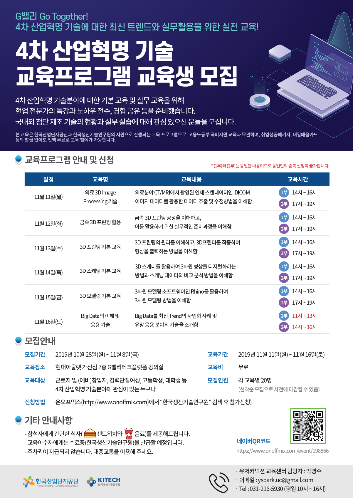 근로자 및 (예비)창업자, 경력단절여성, 고등학생, 대학생 등 4차 산업혁명 기술(3D프린팅, 의료용 3D Image Processing 등)분야에 관심있는 분들의 많은 참여 부탁드립니다.