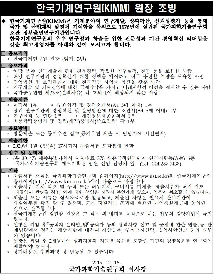 한국기계연구원(KIMM) 원장 초빙