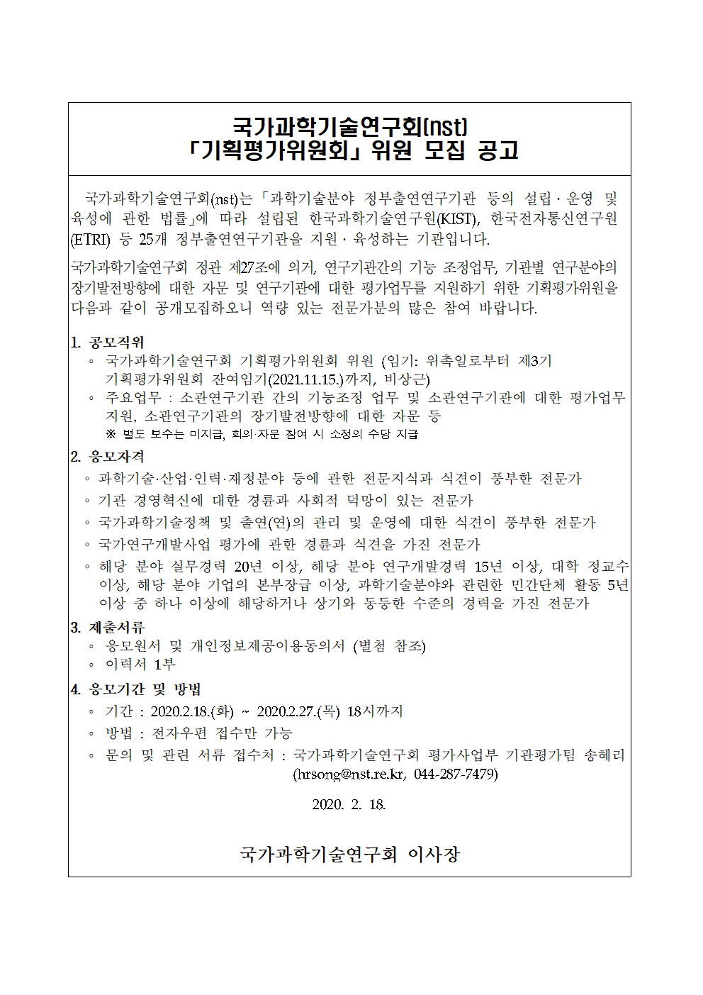 국가과학기술연구회 「기획평가위원회」위원 모집 공고
