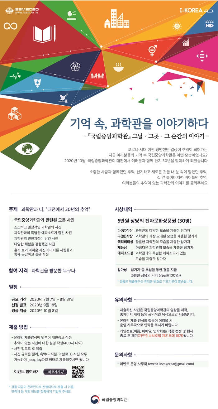 국립중앙과학관에서는 대전이전 30주년을 맞아 아래와 같이 전시관 방문, 과학행사, 과학교육 등 참가 관련 기념사진을 대상으로 아래와 같이 온라인 사진 응모 이벤트를 진행하고 있습니다. 많은 홍보 협조 부탁드립니다.
