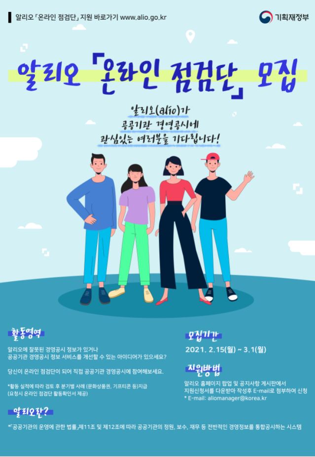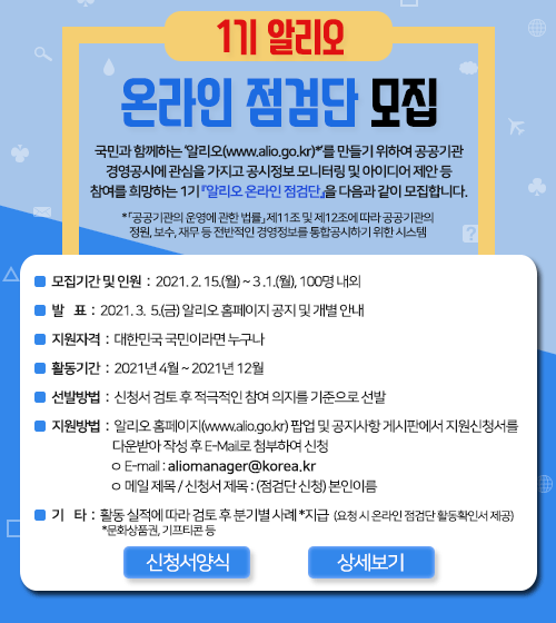 - 알리오에 잘못된 경영공시 정보가 있거나 공공기관 경영공시 정보 서비스를 개선할 수 있는 아이디어가 있을 시 참여
