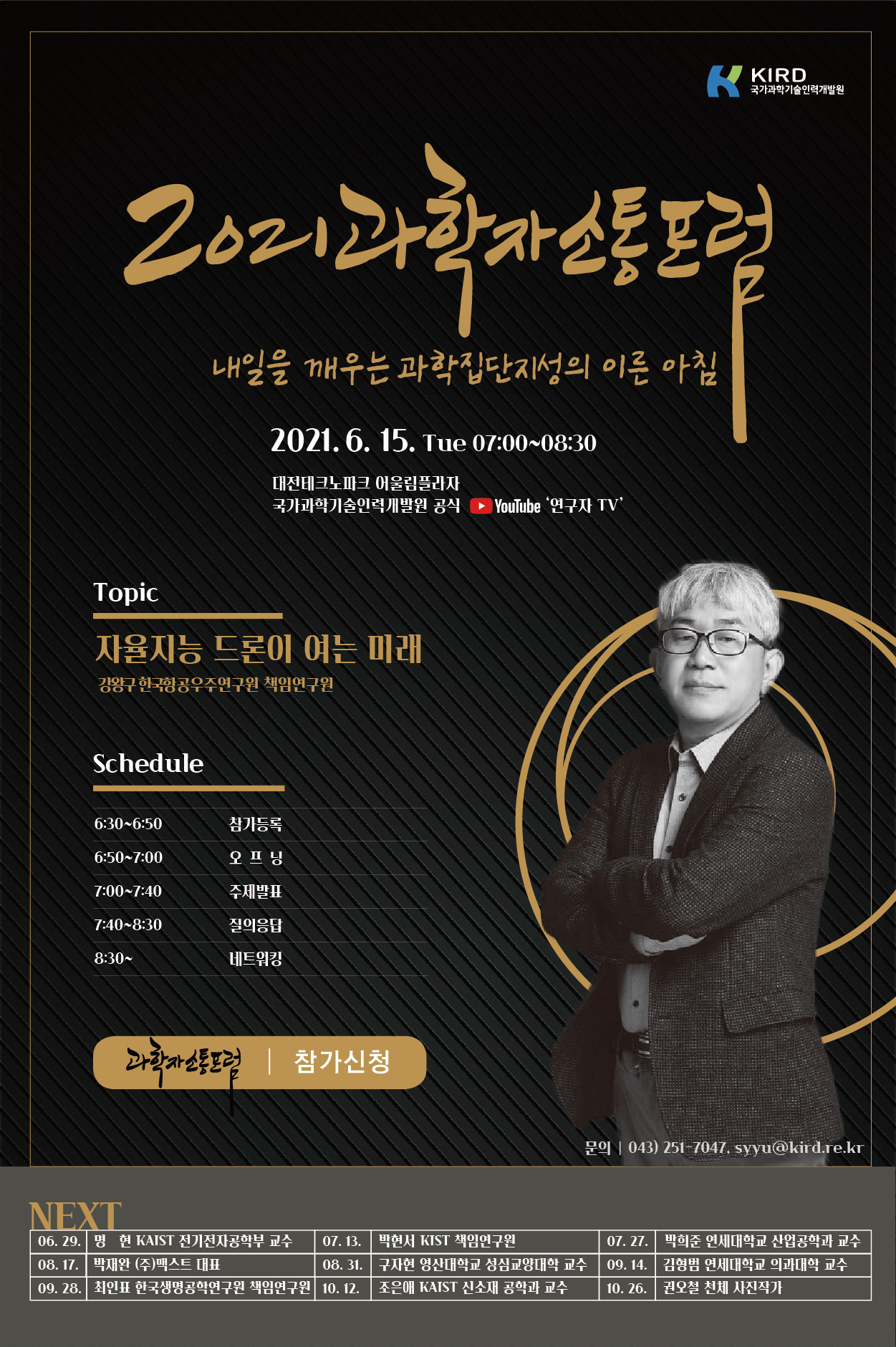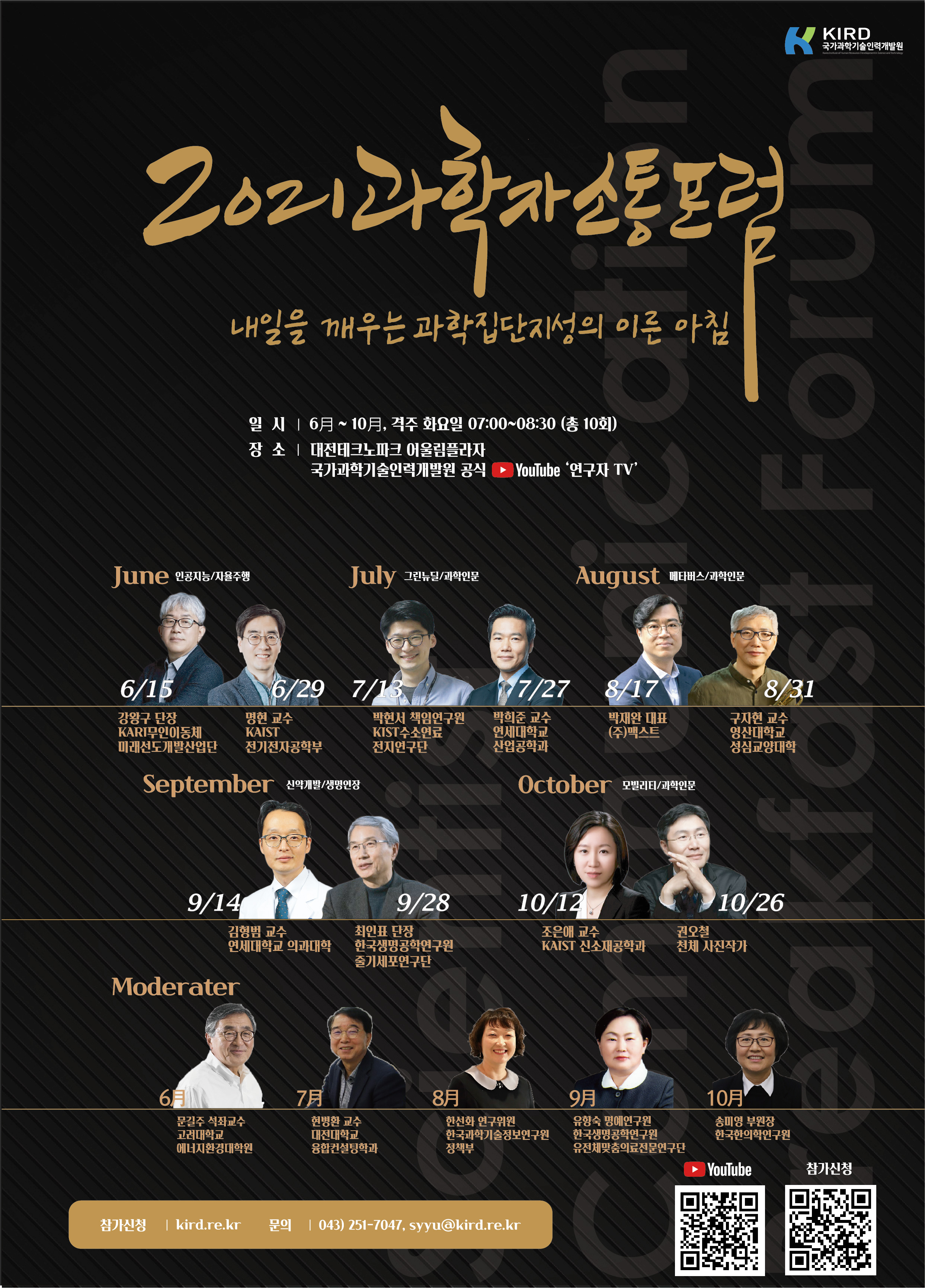 국가과학기술인력개발원에서는 산학연 연구자의 소통 및 협력 활성화를 위해「2021년 과학자 소통 포럼」을 6월 15일(화)부터 5개월간 총 10회 개최합니다.