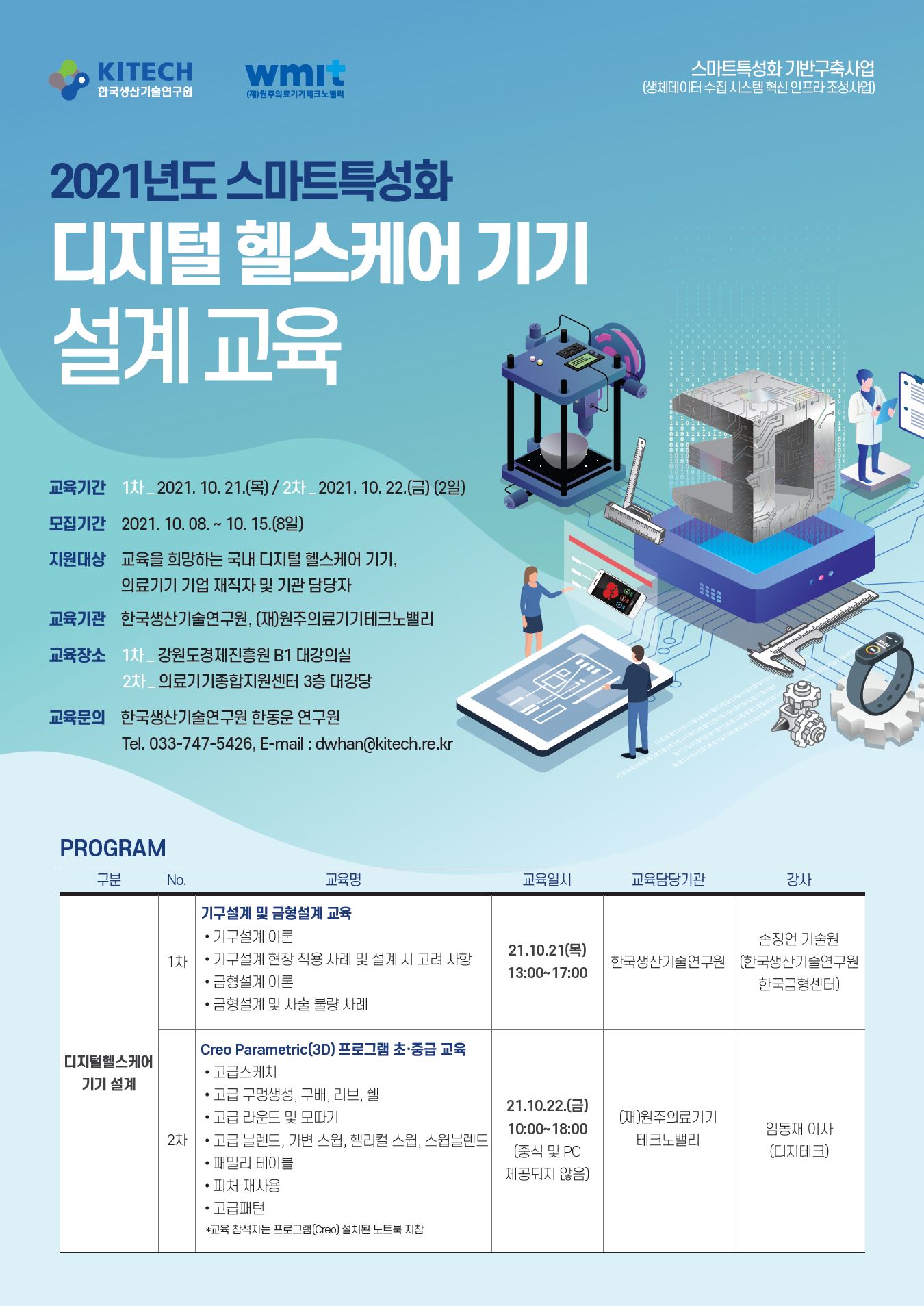 본 교육은 2021년 “스마트특성화 기반구축 지원사업”사업에서 한국생산기술연구원과 (재)원주의료기기테크노밸리가 함께 진행하는 교육으로, 본 교육을 통해 디지털헬스케어 제품 개발 및 고급화를 추진하고자 하는 기업의 설계 역량 강화를 위한 3D 설계, 기구설계, 금형설계 교육 추진으로 관련 기업들의 기술향상 및 산업 경쟁력 강화를 기대하고 있습니다. 디지털헬스케어 기기/의료기기 기업 및 관련 기관 담당자들의 참석 부탁드립니다.