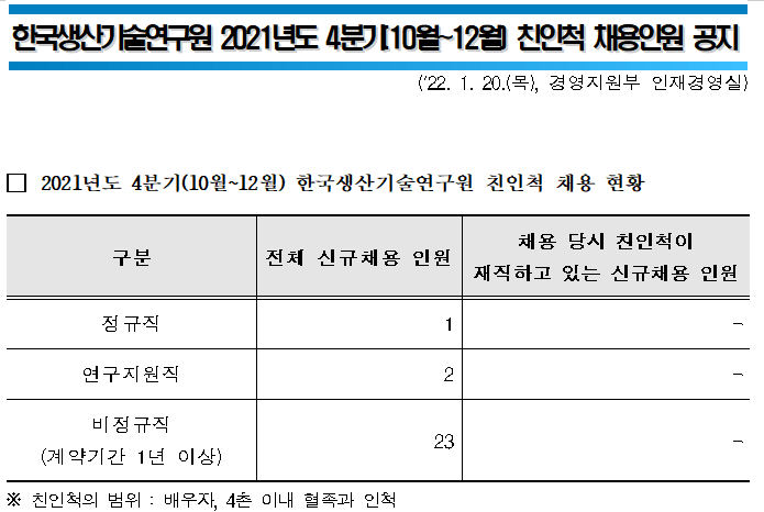 한국생산기술연구원 2021년도 4분기(10월~12월) 친인척 채용인원 공지