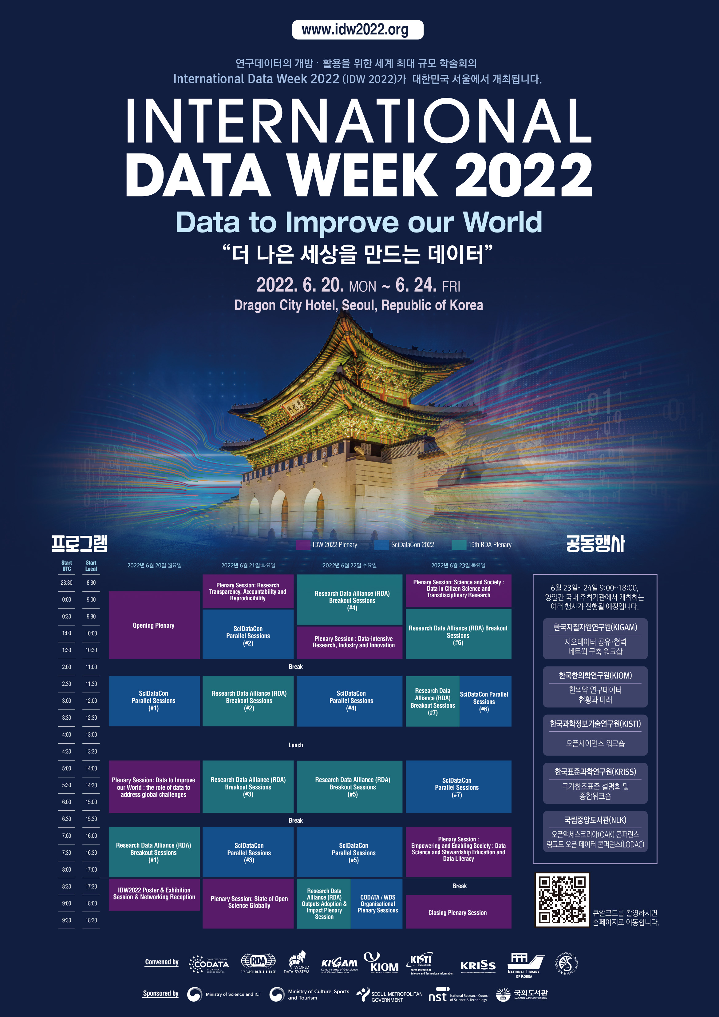 국제과학위원회의 데이터 위원회(CODATA: Committee on Data)와 세계데이터시스템(WDS: World Data System), 그리고 국제연구데이터연맹(RDA: Research Data Alliance)가 함께 공동 주최하는 ‘International Data Week 2022 (IDW 2022)’ 행사가 서울에서 개최됩니다.