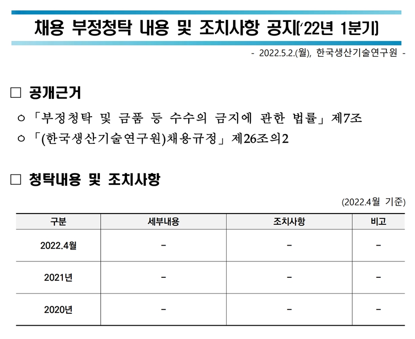 한국생산기술연구원 채용 부정청탁 내용 및 조치사항 공지