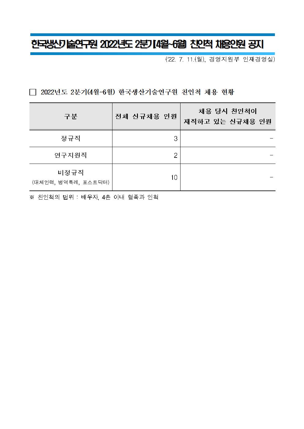 한국생산기술연구원 2022년도 2분기(4월~6월) 친인척 채용인원 공지(해당사항 없음)