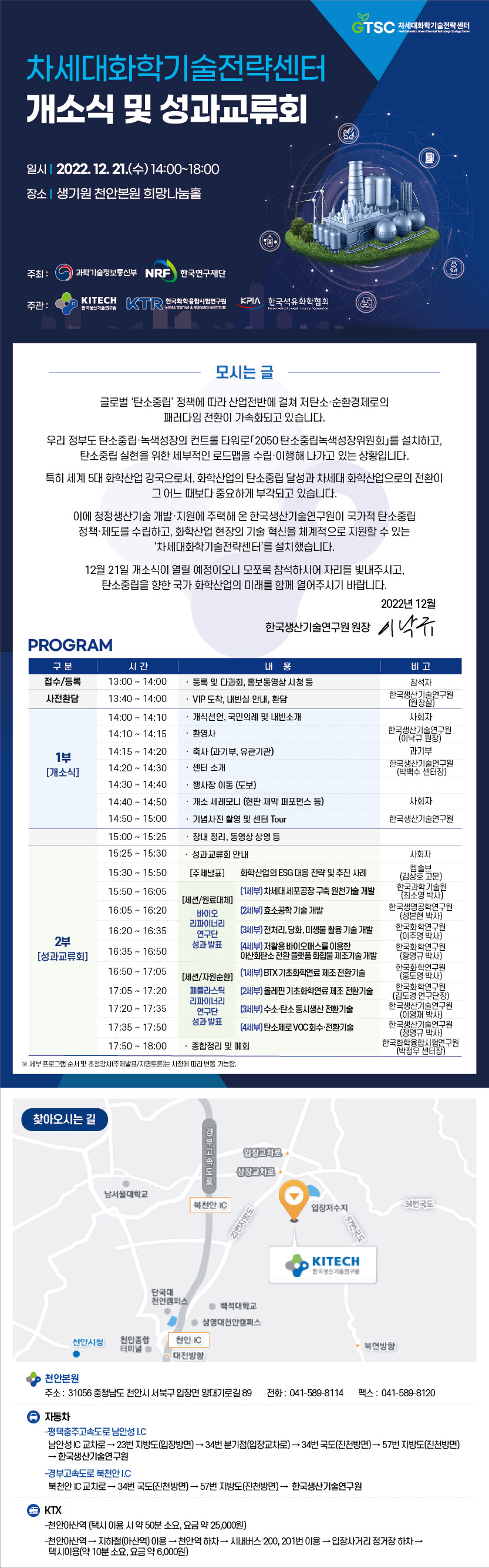 12월 21일 개소식이 열릴 예정이오니 모쪼록 참석하시어 자리를 빛내주시고, 탄소중립을 향한 국가 화학산업의 미래를 함께 열어주시기 바랍니다.