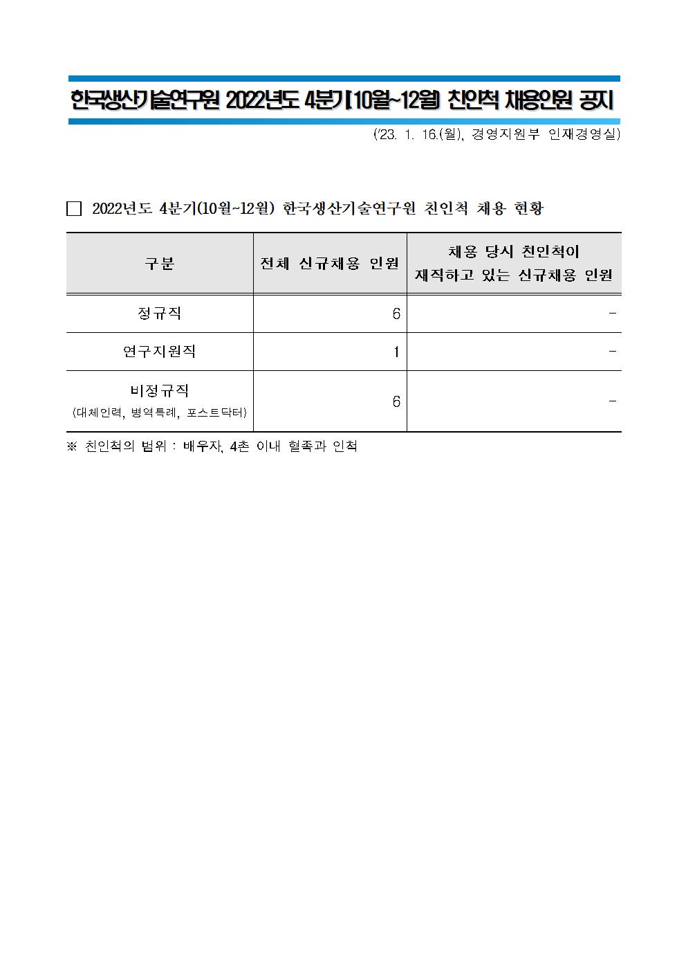 한국생산기술연구원 2022년도 4분기(10월~12월) 친인척 채용인원 공지(해당사항 없음)