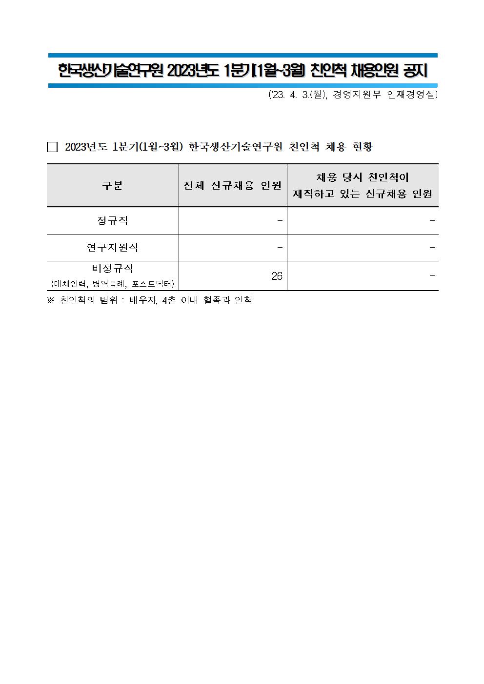 한국생산기술연구원 2023년도 1분기(1월~3월) 친인척 채용인원 공지(해당사항 없음)