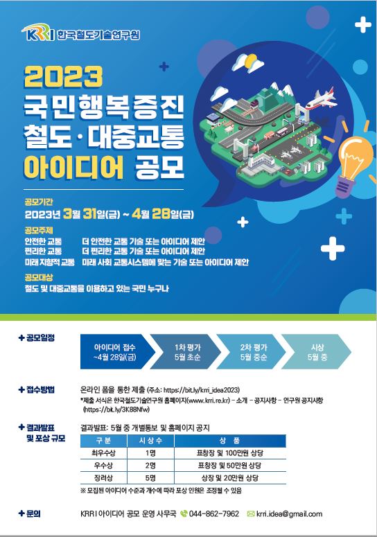 [한국철도기술연구원] “국민 이동불편을 교통기술로 해결한다 !” 2023 국민행복증진 철도 ․ 대중교통 아이디어 공모