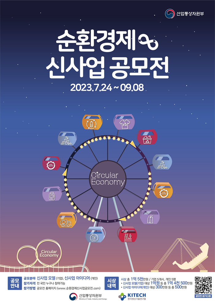 산업통상자원부와 한국생산기술연구원은 순환경제의 산업범위를 IT, 서비스 융합 등의 범위로 확대하여 신산업 동력으로 육성하기 위한 「순환경제 신사업 공모전」을 아래와 같이 개최합니다. 동 공모전에 많은 관심과 참여를 바랍니다.