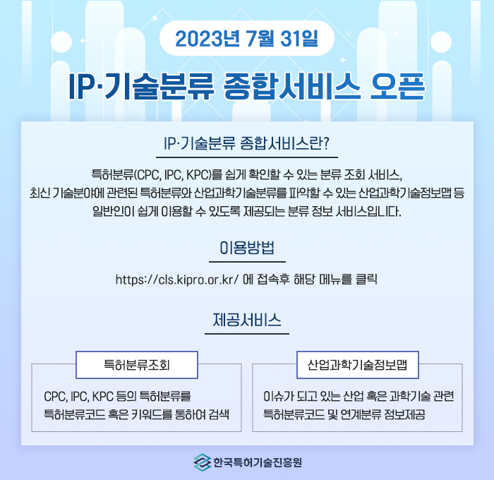 특허분류 조회서비스를 정식 오픈하였기에 알려드립니다. 많은 관심 부탁드립니다.