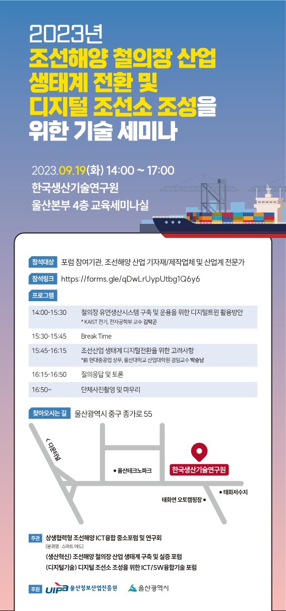2023년 조선해양 철의장 산업 생태계 전환 및 디지털 조선소 조성을 위한 기술세미나 안내 드립니다. 관심 있는 분들의 많은 참여 바랍니다.