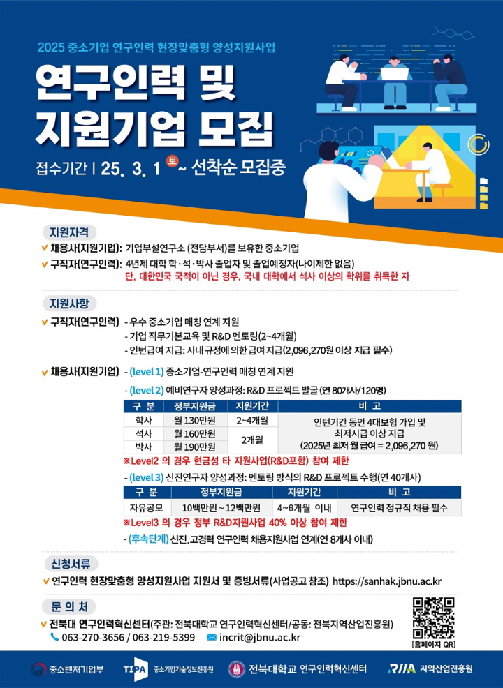 [전북대학교 연구인력혁신센터] 2025년 중소기업 연구인력 현장맞춤형 양성지원사업 연구인력 및 지원기업 모집