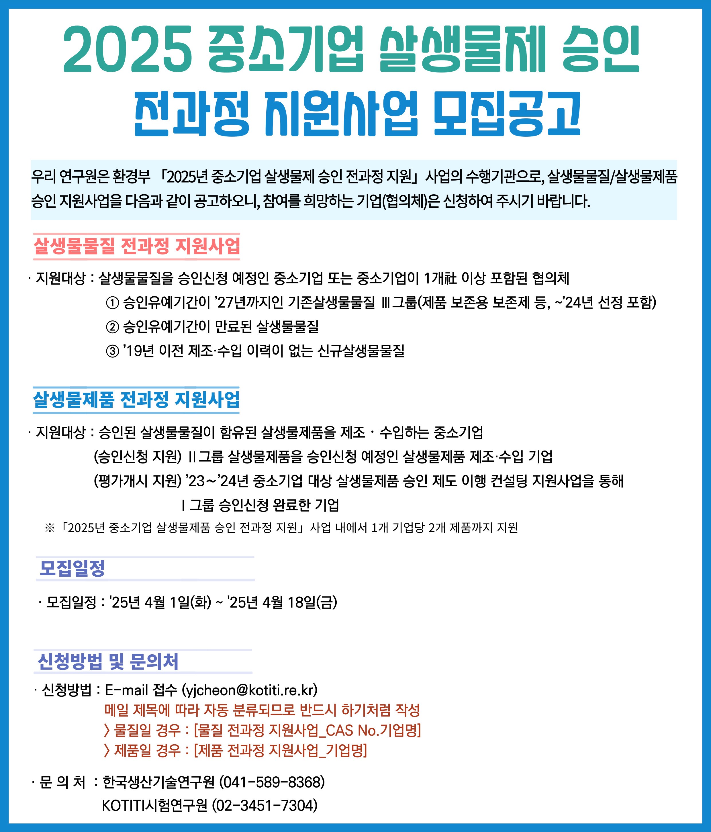 2025년 중소기업 살생물제 승인 전과정 지원사업 모집공고(~4/18)